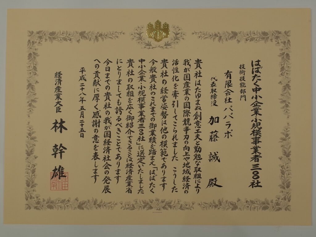 平成28年5月25日(水) 有限会社パパラボが 「はばたく中小企業・小規模事業者300社」 として中小企業庁より選定されました。